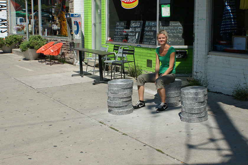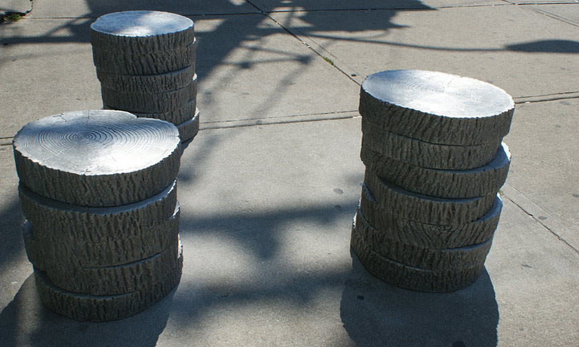 Kensington Market / City of Toronto Stoop Seating project Stacked tree "rounds" in cast aluminium Artist: Jana Osterman